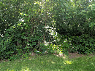 Over the course of the weekend, I cleared the 10' left of the back wood line to the little path to the composting foundation. Under the blackberry and multiflora rose and poison ivy, I found a pretty little spiraea - a friend of mine versed in these things thinks it's S. latifolia, "Meadowsweet". (Thanks Camille!)